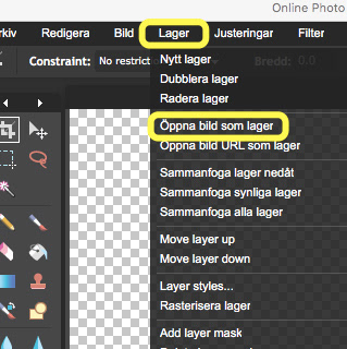 Klicka på LAGER och välj ÖPPNA BILD SOM LAGER från rullningslisten.